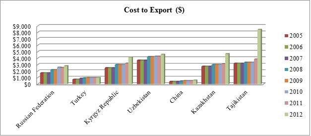 The figure 8 illustrates the cost to export; which simply means how much a country would pay in order to export to these countries listed in the figure. Per container prices show that Tajikistan is the most expensive country in SCO by its more-than-8.000 $ cost to export, due to the sharply increasing prices of main export-import products. Kazakhstan, Uzbekistan, Kyrgyz Republic and Russian Federation follow Tajikistan, respectively. China sparkles as the best country to start export among others by having the lowest cost to export while Turkey has close numbers to China. Tajikistan is considered as the worst.